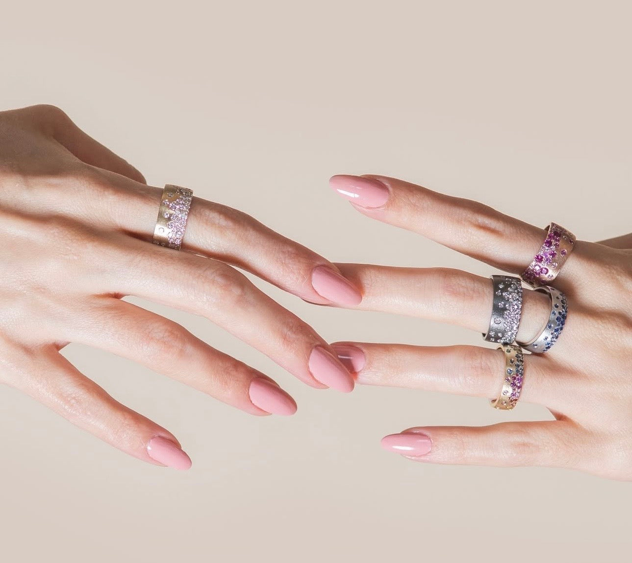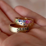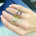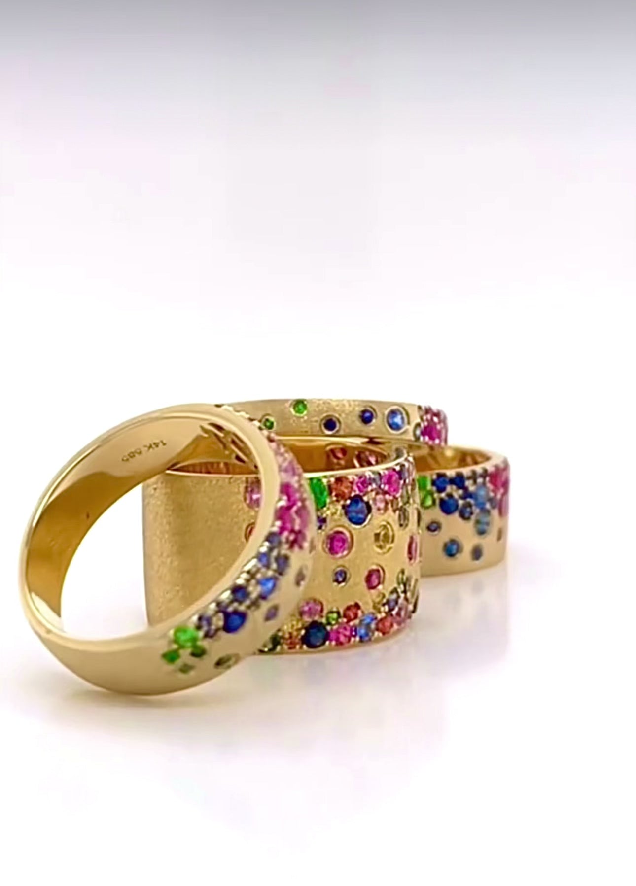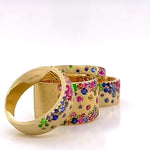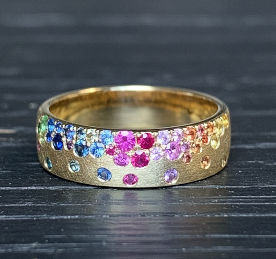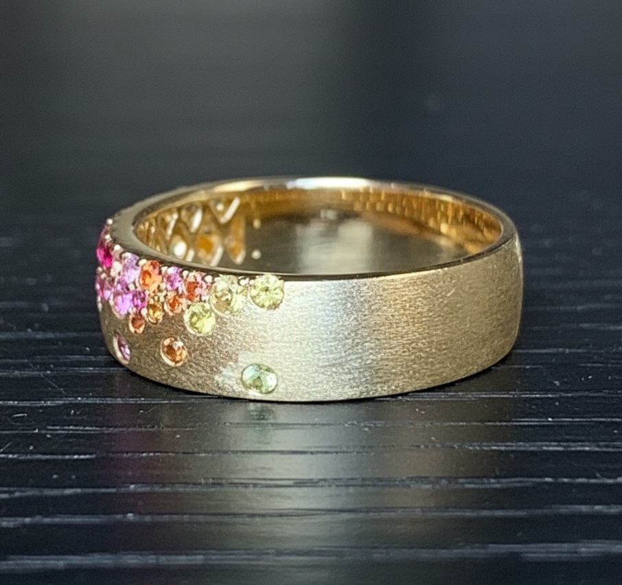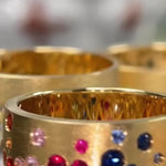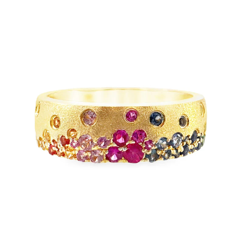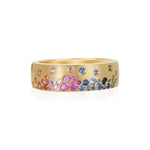A timeless expression of color and craftsmanship. The Scattered Rainbow Mini Cigar Band from Cleo & Me’s Scattered Rainbow Collection is handcrafted in solid 14K yellow gold with a refined satin finish. Across its 5.75mm wide band, rainbow sapphires totaling 0.62 carats are delicately flush-set to form a constellation of vibrant light.