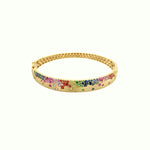 Step into a world of color and craftsmanship with the Scattered Rainbow Signature Bangle, a statement masterpiece from Cleo & Me’s Scattered Rainbow Collection. Meticulously crafted in solid 14K yellow gold with a refined satin brushed finish, this luxurious 8.5 mm bangle gleams with 2.55 carats of rainbow sapphires, each gemstone hand-set in an organic, scattered pattern that evokes the beauty of light dancing across the sky.