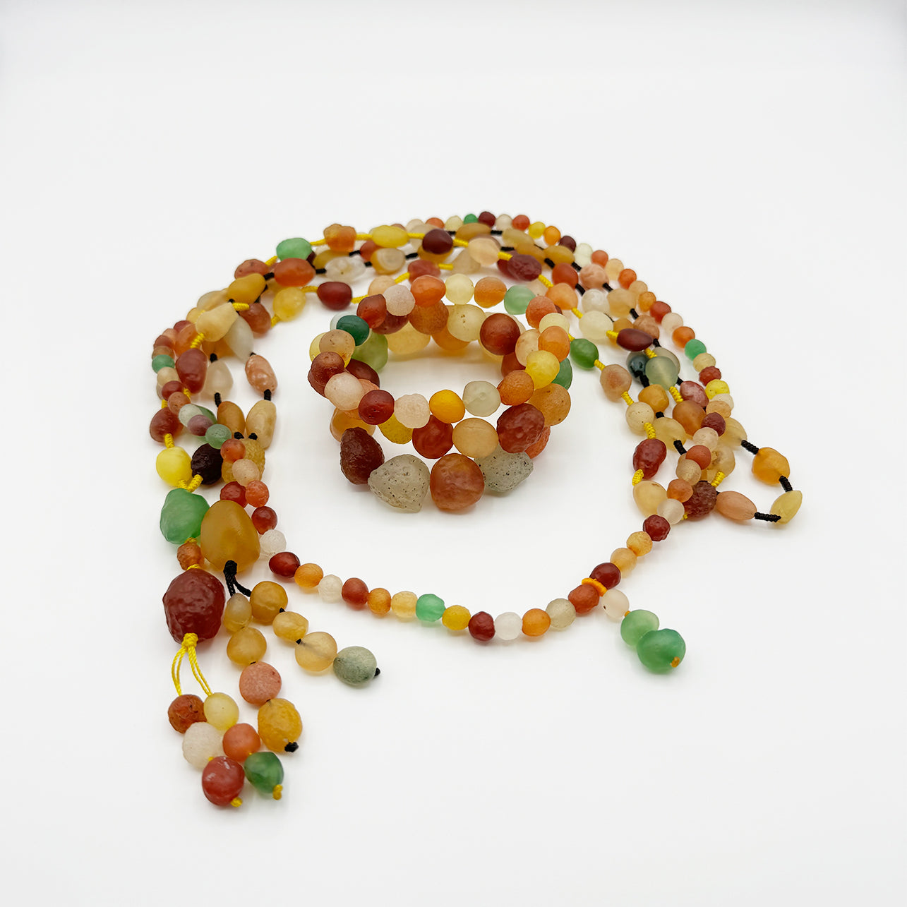 The Alashan region is known for its rich geological history and is home to various mineral deposits, including the agate that is found there. Alashan Gobi Agate is prized for its distinctive patterns and textures, which include bands of brown, red, orange, dark green, yellow, white, and gray, and the texture in each stone is one-of-a-kind and uniquely shaped by nature. Rough stones of candy agate are usually found in irregular shapes and granular gravels. These agates naturally form in grape-like clusters, or a botryoidal structure, which is a less common natural formation. It can be worn in its original, rough form or cut and polished into cabochons, beads, and other decorative objects. In addition to a variety of body colors, these agates occasionally present color zoning between the inner core and the outer layer. The colored inner core, which makes the agate special and valuable, is nature’s gift in natural candy agate from the Alxa Plateau. The colorful agates heap together and form in different sizes, which makes them look like candy, mochi, or dry grapes.