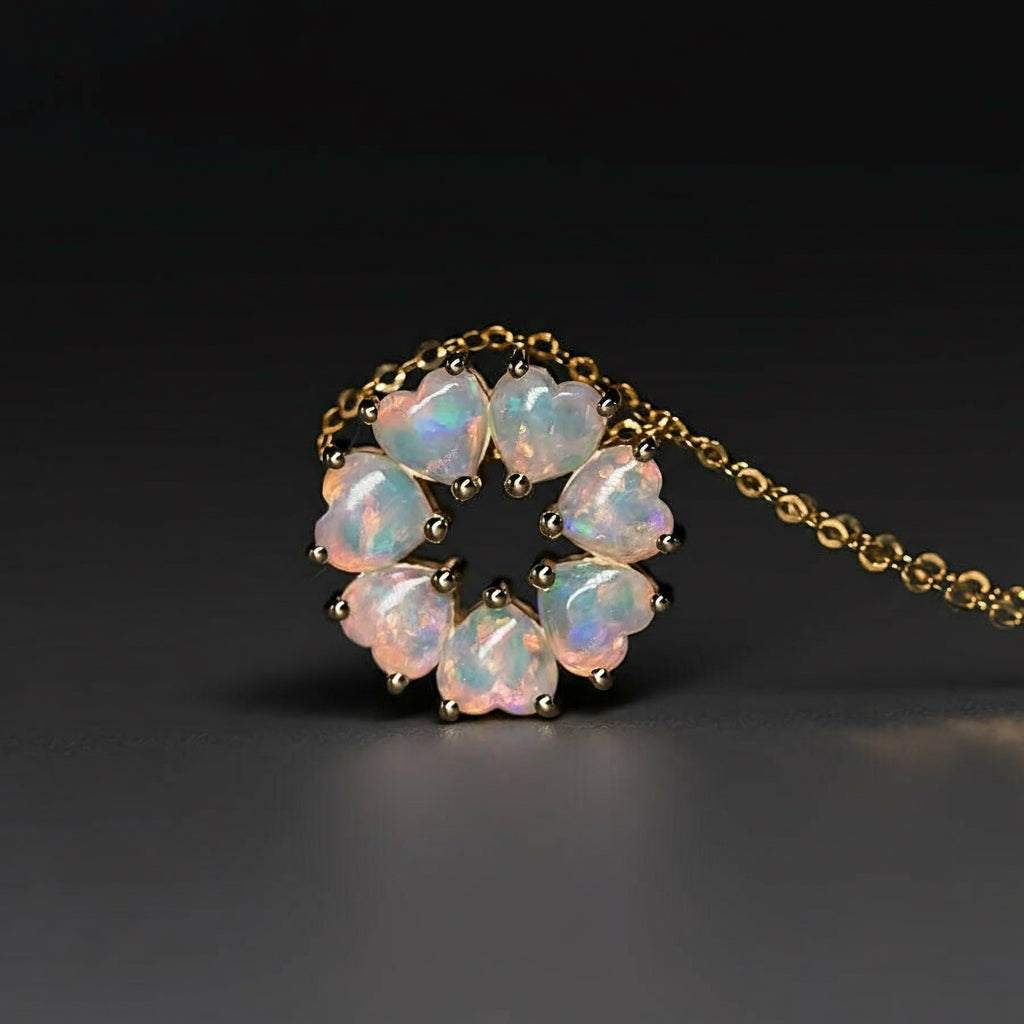 Heart Shaped Australian Crystal Opal in Eternity Circle Pendant Necklace in 14K Yellow Gold.