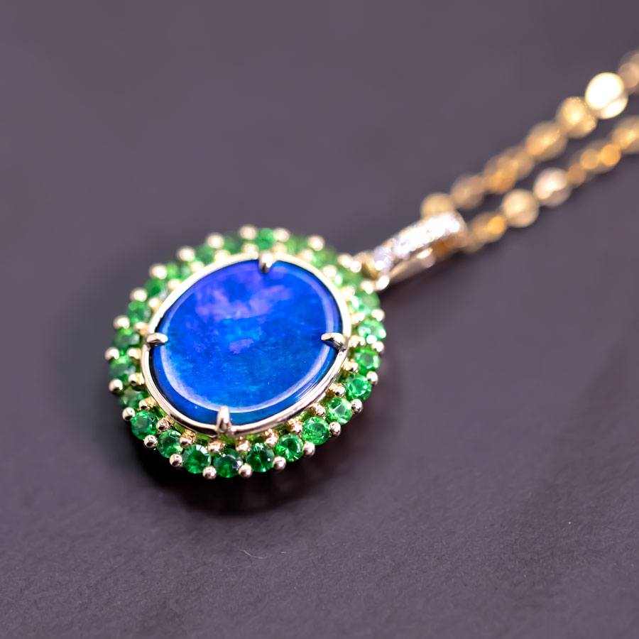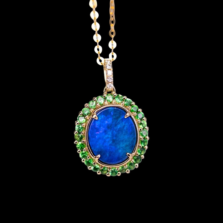 N1 Black Opal Halo Tsavorite Diamond Pendant Necklace in 18K Yellow Gold.