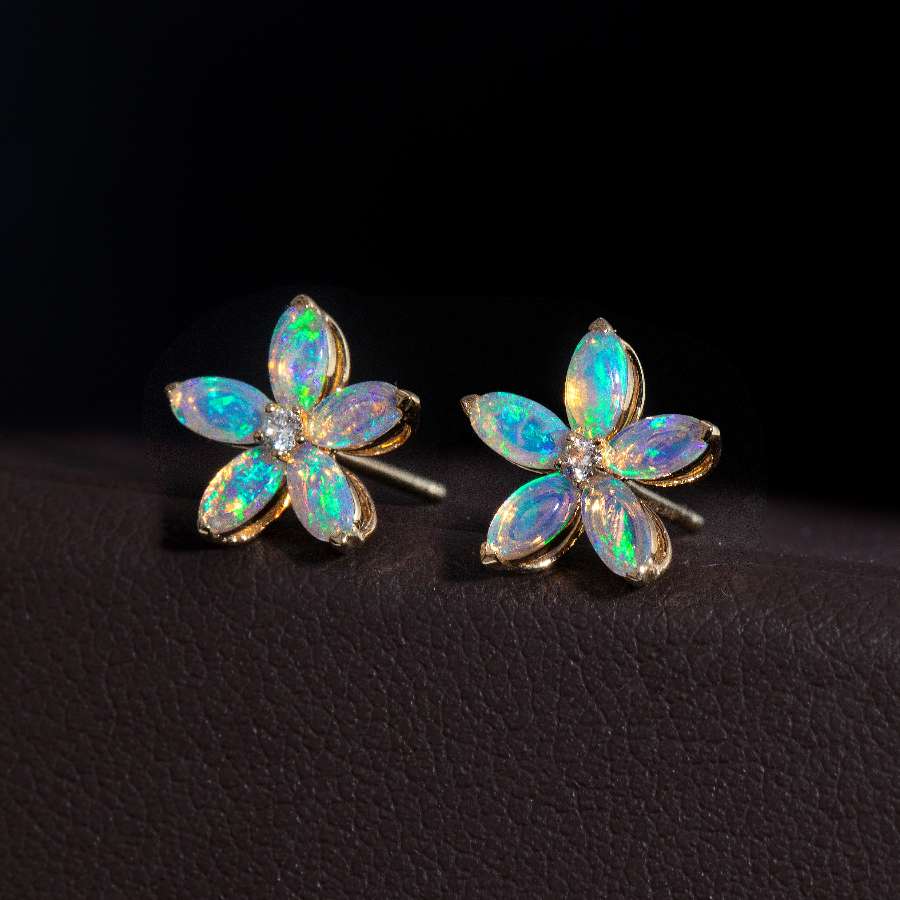 Australian Solid Opal Diamond Sakura Cherry Blossom Flower Stud Earrings in 14K Yellow Gold.