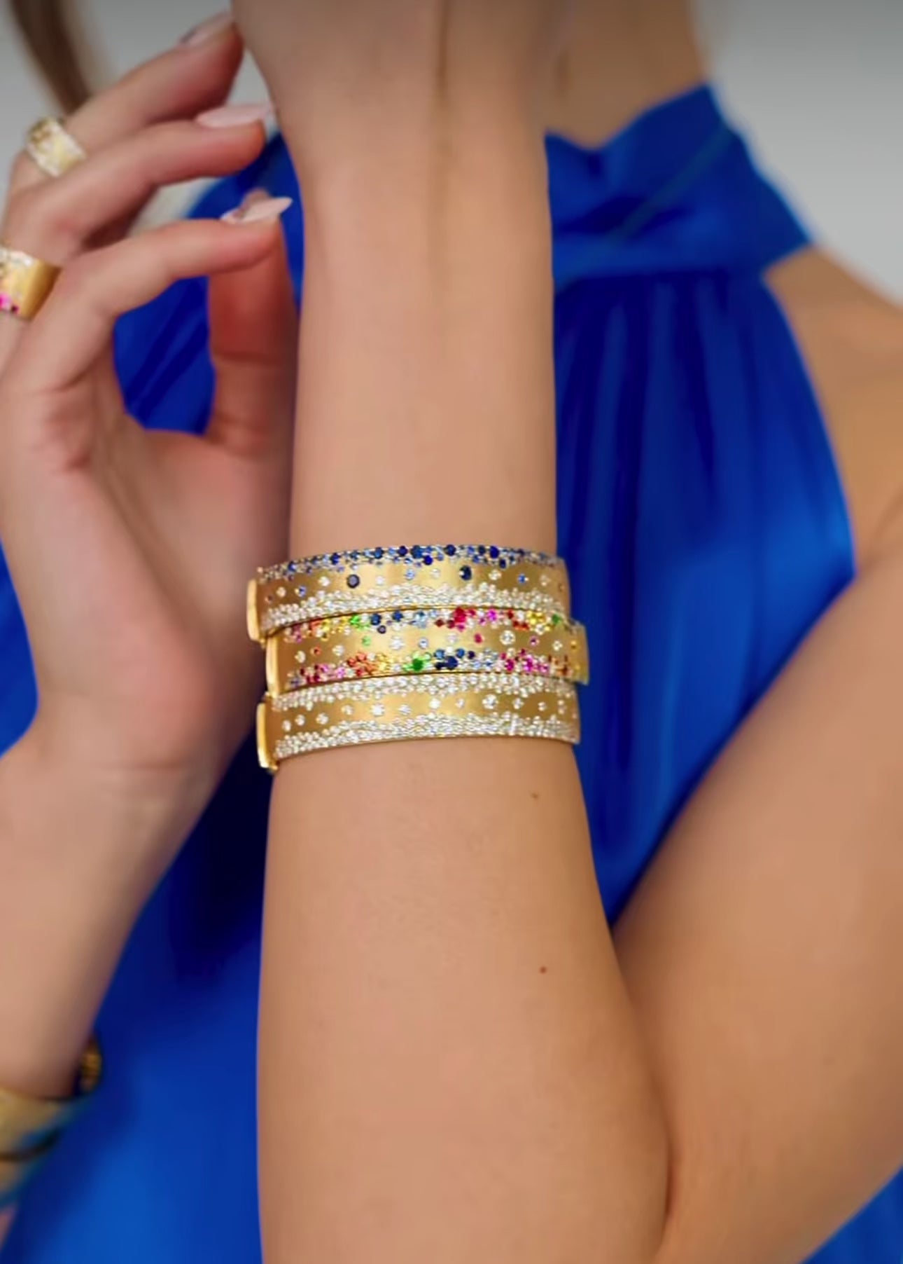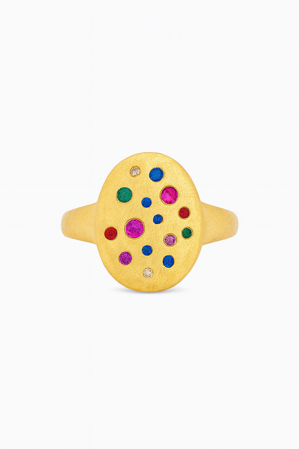 Illuminate your look with the vibrant glow of Cleo & Me’s Scattered Rainbow Concave Ring, a bold yet refined statement piece from our Scattered Rainbow Collection. Expertly crafted in solid 14K yellow gold with a luxurious brushed matte finish, this ring features a graceful concave silhouette adorned with flush-set rainbow sapphires that dance across the golden surface in an artful scatter of color and light.