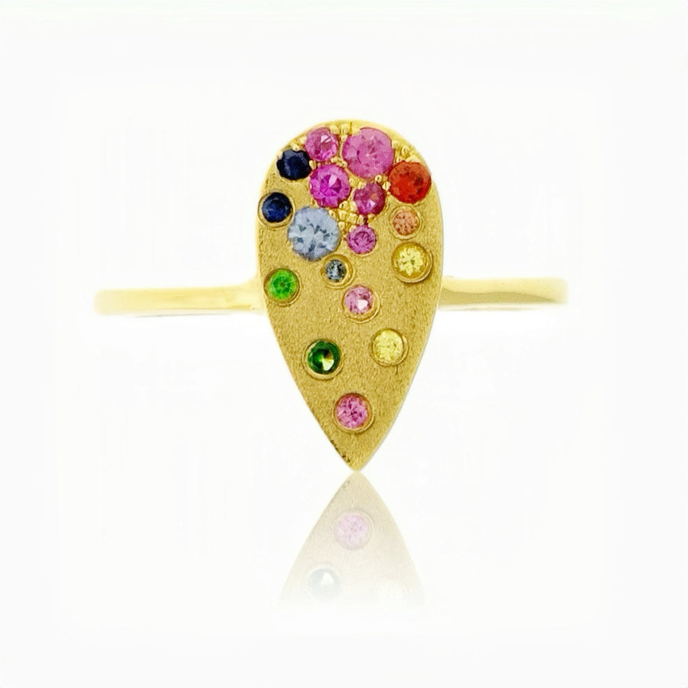A poetic union of color and craftsmanship, the Scattered Rainbow Pear Ring captures the radiance of a celestial droplet in gold. Handcrafted in solid 14K yellow gold with a satin-brushed finish, this elegant pear-shaped design shimmers with hand-set rainbow sapphires (0.30 ct total weight).